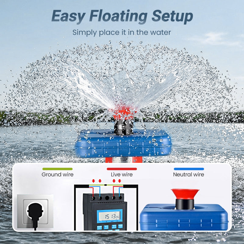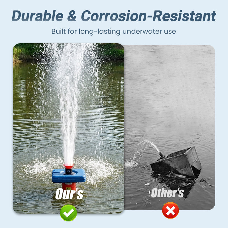 Verbessern Sie die Wasserqualität. Mit unserem 2-in-1-Teichbelüfter erleben Sie Sauerstoffanreicherung und Pumpfunktion. 550W Kupfermotor, 12m³/h Durchfluss, schwimmende Installation. Robust, energieeffizient, langlebig. Bestellen Sie jetzt!