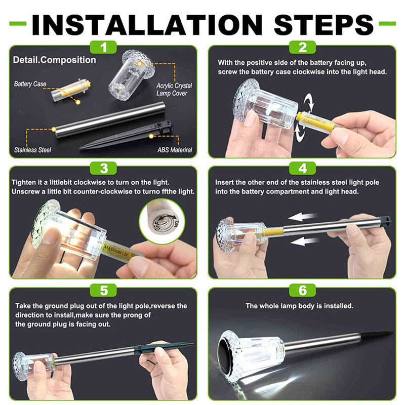 Jede Leuchte enthält einen 1 x 150mAh AAA Ni-Cd 1,2V Akku, der bei voller Ladung über 8 Stunden Beleuchtung bietet. Genießen Sie helle, energieeffiziente Beleuchtung, die die ganze Nacht anhält.