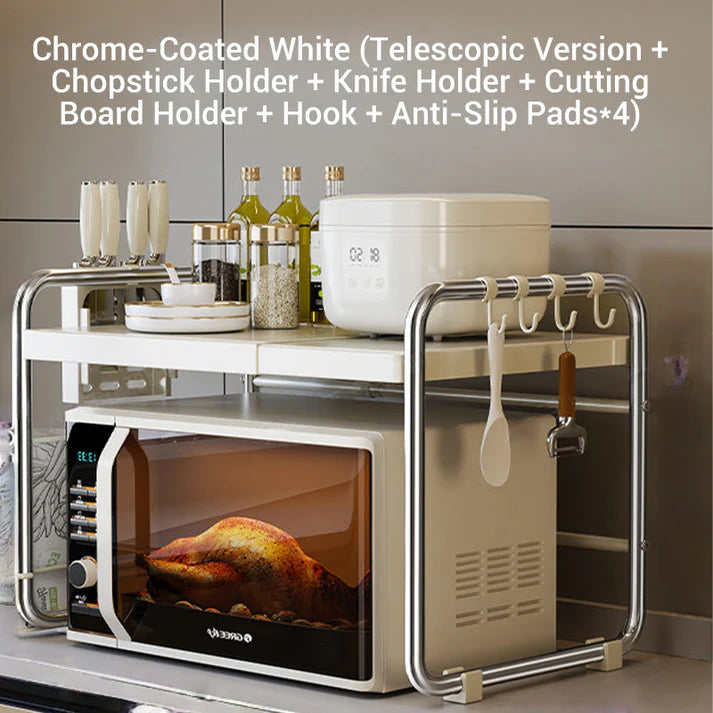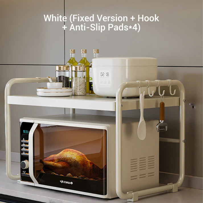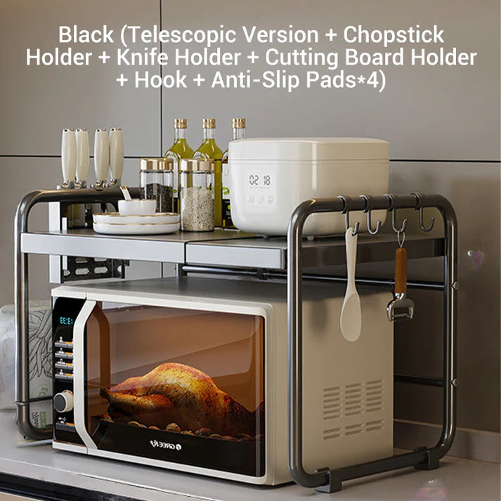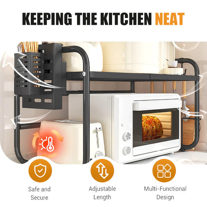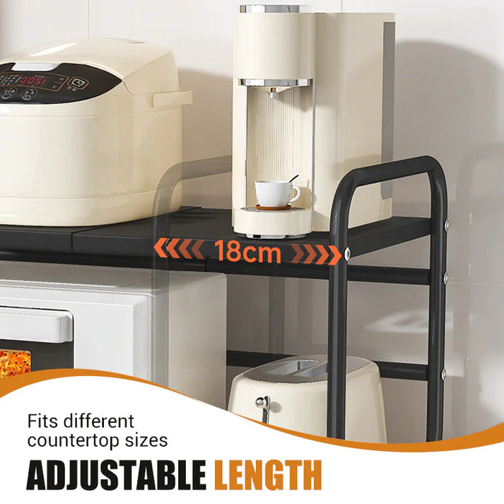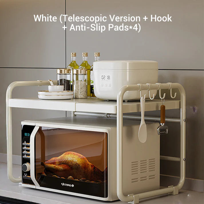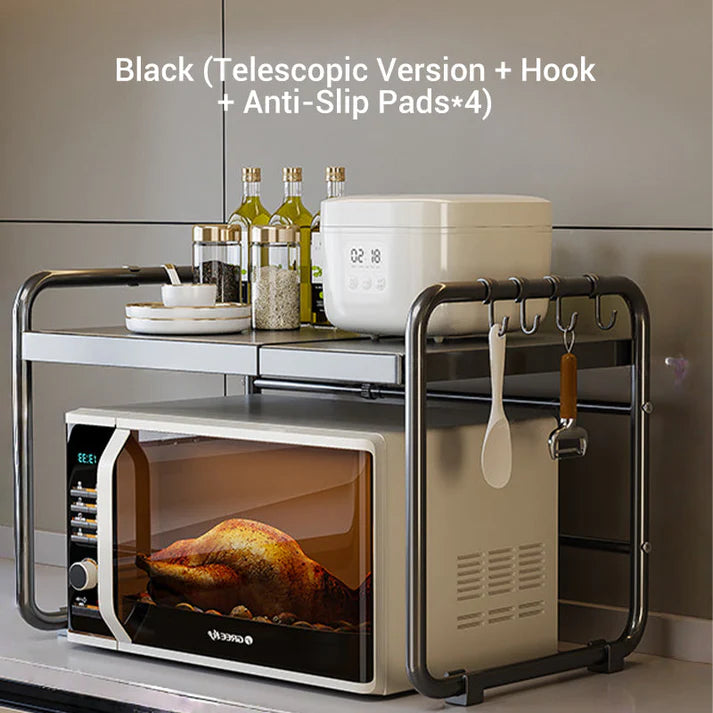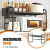 VERSTELLBARE LÄNGE – Der 2-stufige verstellbare Mikrowellenrost verfügt über ein Teleskopdesign, mit dem Benutzer den Rahmen aus- oder einfahren können, um ihn perfekt an unterschiedliche Arbeitsplattenbreiten anzupassen. Unabhängig davon, ob Ihre Küche kompakte Flächen oder größere Flächen hat, sorgt die flexible Länge für eine optimale Raumnutzung. Die Installation ist werkzeuglos und mühelos, so dass der Rost je nach Küchenlayout oder Aufbewahrungsbedarf leicht neu positioniert werden kann, was eine nahtlose Lösung für das Raummanagement bietet.