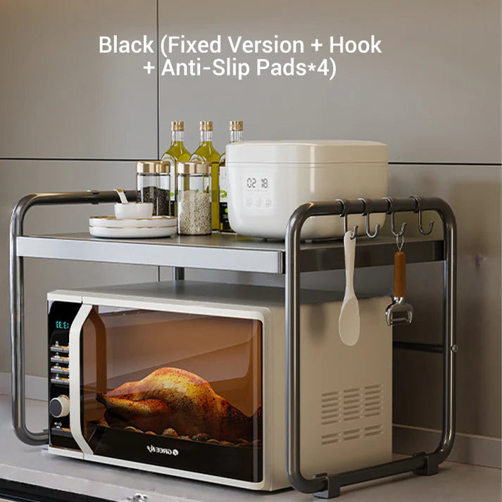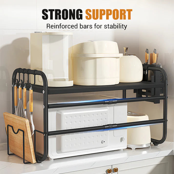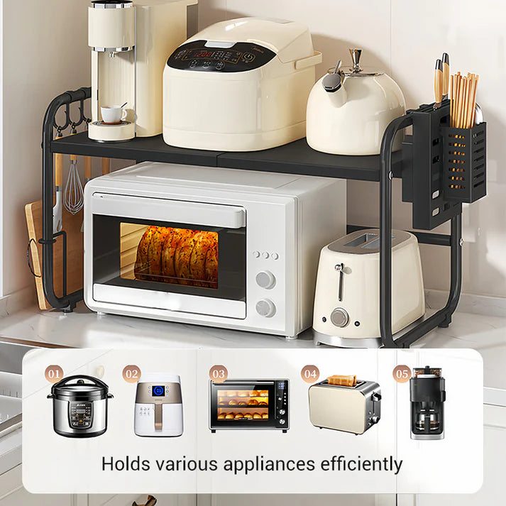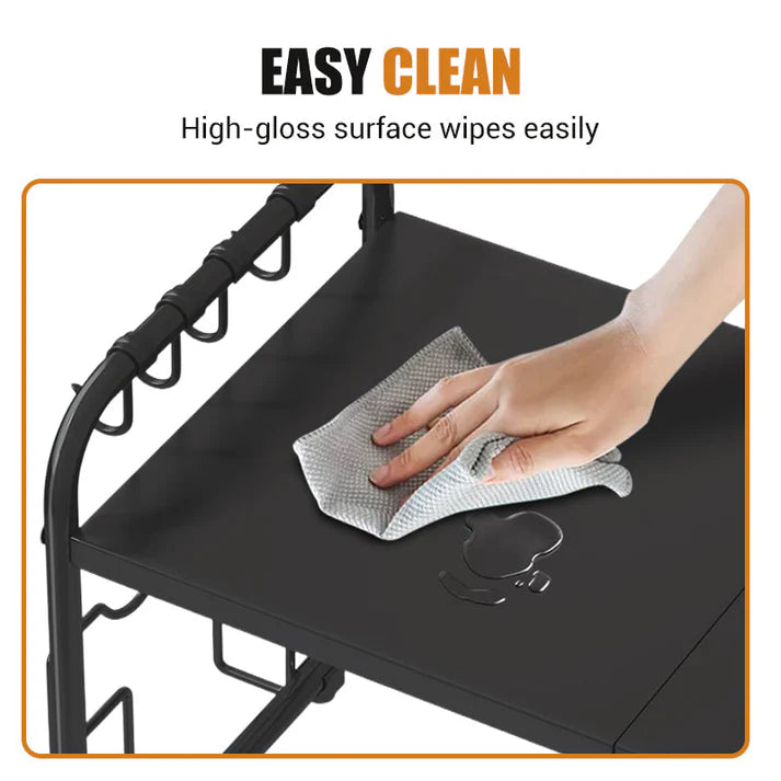 STARKE UNTERSTÜTZUNG – Ausgestattet mit verstärkten Stahlstützstangen ist das Gestell so konstruiert, dass es schwere Geräte wie Mikrowellen, Toaster und Kaffeemaschinen sicher hält. Die verstärkte Struktur verhindert ein Verbiegen, Wackeln oder Instabilität unter Gewicht. In Kombination mit der langlebigen Konstruktion sorgt dieses Gestell für langfristige Zuverlässigkeit und gibt dem Benutzer Sicherheit, wenn er mehrere oder sperrige Geräte in seiner Küchenumgebung aufbewahrt.